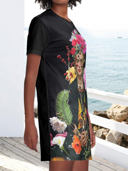 Black Floral Printed Pockets Short Sleeve Casual T-shirt Dresses