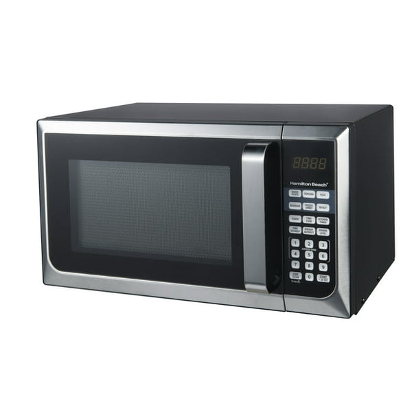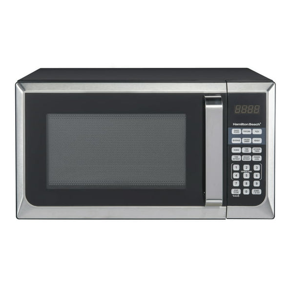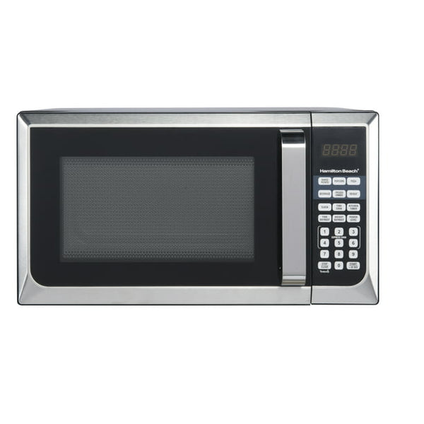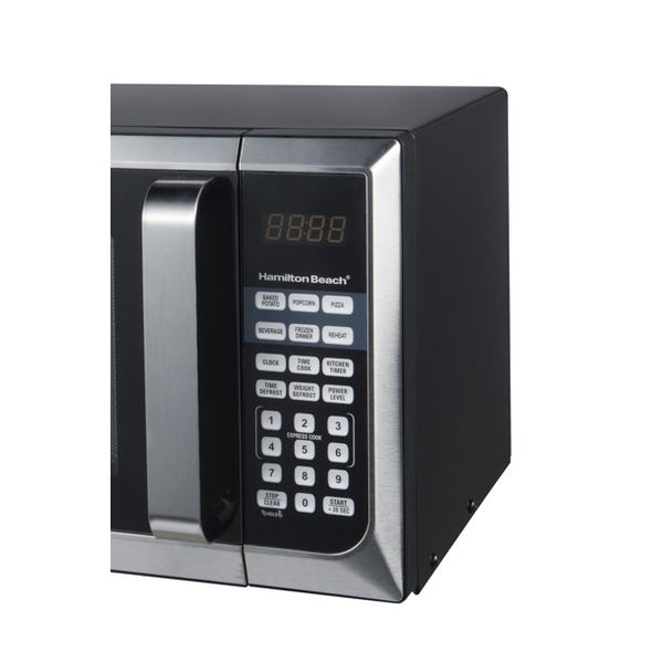 Sharp design in stainless steel, this microwave oven fits your modern kitchen and offers a variety of menu choices to complete your cooking tastes and style. It has an output of 900 watts and includes 10 power levels. The LED display is simple to read, and the touch-pad makes it easy to control. This 900 watt microwave oven includes a lockout feature for child safety, as well as a timer and clock feature. It allows you to cook potatoes, popcorn, reheat frozen dinners, pizza or beverages with just one touch. It's designed to give you even heating for consistent results that you can feel good about feeding to your family.