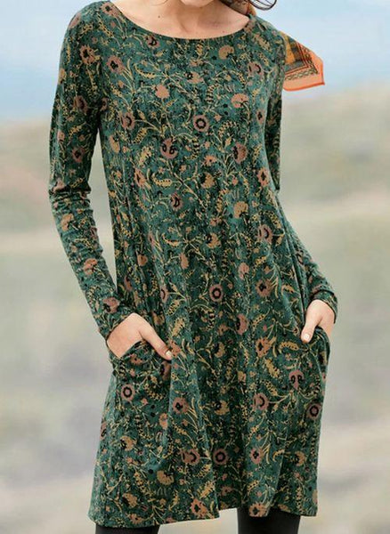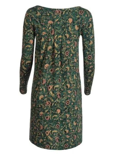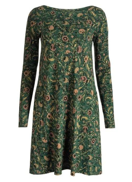 Pretty wildflowers climb the emerald ground of this casual jersey dress. Year-round wearable in travel-ready pima (51%) and modal (49%), it's styled with a boatneck, pockets and back yoke with box pleat for an easy A-line shape.
